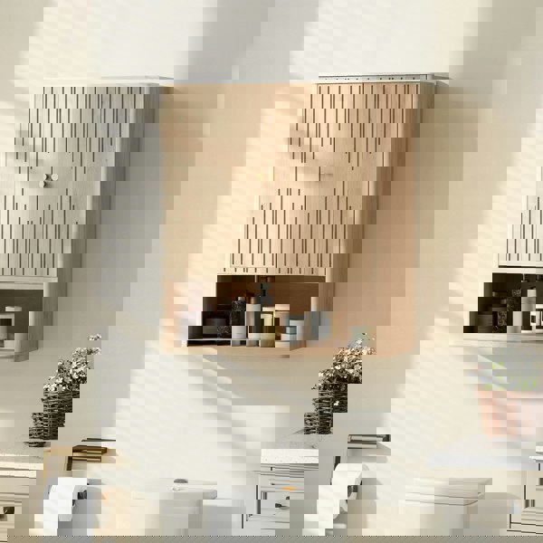 Featuring an adjustable internal shelf alongside an open shelf, this cabinet offers flexible organisation for a range of toiletries and skincare. Finished in oak, it brings a warm, considered look to your bathroom while supporting a more ordered countertop.
