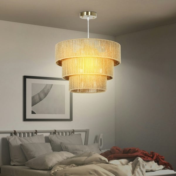 Elevate your space with the HOMCOM Boho-style ceiling lighting, featuring a unique three-tier hemp rope lampshade that adds a charming touch to any room. Suit for a bedroom or living room, the power cord length can be adjusted during installation to suit your styling needs. Now, choose an optimal bulb to illuminate your space just the way you like it.
