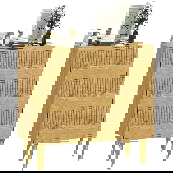 Bring a clean, contemporary look to your space with the HOMCOM chest of drawers, finished in an oak grain effect with carved drawer fronts. Set on steel legs, it offers a considered balance of everyday storage and a lighter visual footprint, making it a practical choice for bedrooms and other living areas where you want essentials kept neatly out of sight.