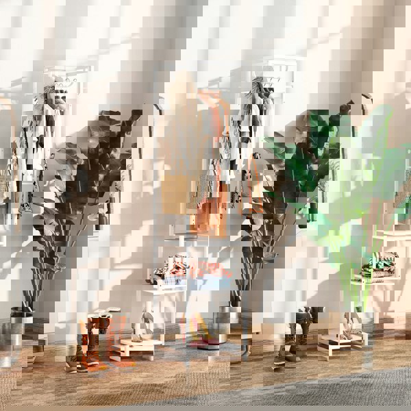 Whatever the size space, this HOMCOM clothes rail fits in. This space-saving piece merges together a 40cm rail, three shelves and eight hooks - keep plenty of garments and accessories in one place. Its powder coated steel frame means a strong and supportive core, and comes in an Industrial design for a striking addition to any space.
