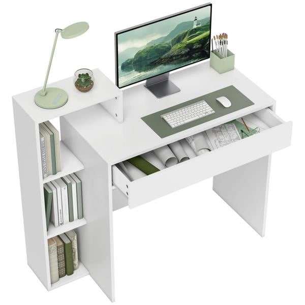 Designed for smaller work areas, the HOMCOM computer desk brings a clean, modern look to bedrooms, dorms and compact spaces. Finished in white, it combines a practical desktop with open shelving and a drawer to keep everyday essentials close at hand.