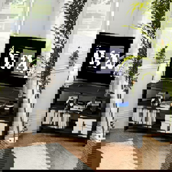 Transform your cosy corner into the optimal chill-out zone with the HOMCOM TV stand. Its clever corner design maximizes space while the two open shelves and flat top keep your media essentials organised. Made for up to 47" screens, this TV table stand blends functionality with a sleek, minimalist style that ups the ante of any room's ambiance. No more awkward gaps—just smart, stylish storage for your TV and gear!