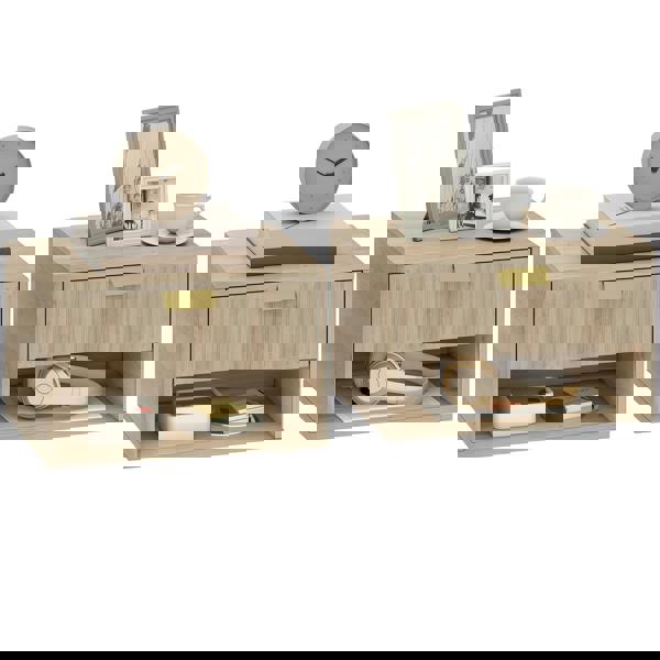 Each wall mounted bedside table combines a smooth-gliding drawer for discreet storage with an open compartment for items you want close at hand. Wave-textured drawer fronts and gold-tone handles add a modern decorative touch, while the particleboard construction with a melamine finish is water-resistant for easier day-to-day cleaning.