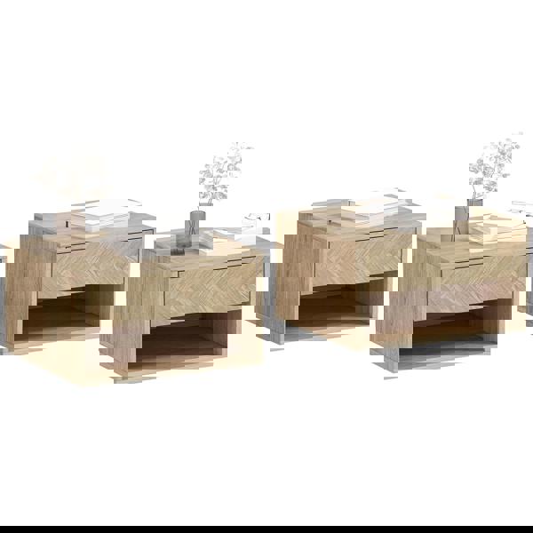 These two HOMCOM bedside tables offer you double the storage for a single package. Set up together in the same space or just separately: do it your way. Made from particle board, each nightstand is solid, featuring a drawer and an open shelf, with a flat top: plenty to hold bedtime essentials. Fixed to the wall, no floor space is required for these floating nightstands.
