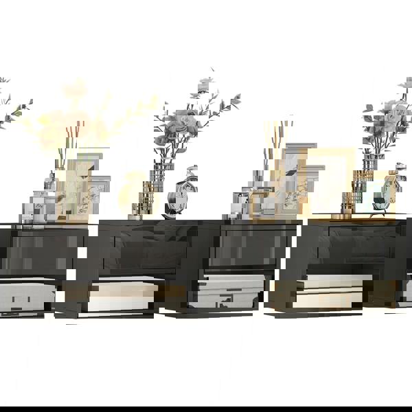 Each nightstand combines a slide-out drawer with an open shelf, offering a practical mix of concealed and easy-access storage for smaller items. Made from particle board and built for everyday use, the design balances a streamlined profile with functional capacity, making it well suited to compact spaces as well as larger bedroom settings where you want a more minimal finish.