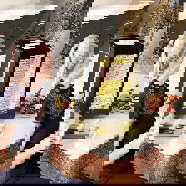 Easy, customisable homemade snacks, with this HOMCOM food dehydrator. It has 12 stainless steel trays: plenty of room for ingredients; also easy to separate to avoid cross contamination. It's fitted with a powerful rear air outlet to ensure even and efficient drying - so the ingredients comes out the same. Adjust the temperature between 40°C-70°C, and use the 48-hour timer to get the perfect garnishes every time. Complete with inner lights to see inside easily.