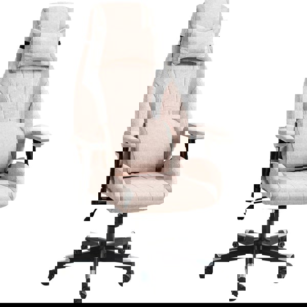 Dive into comfort with the HOMCOM Computer Gaming Chair, featuring a curved back and seat with a lumbar support pillow and headrest that cradle you from head to thigh. Wrapped in a breathable, pink velvet-feel fabric with mesh sides, this pink computer chair combines style with comfort, suitable for any gaming setup or office.