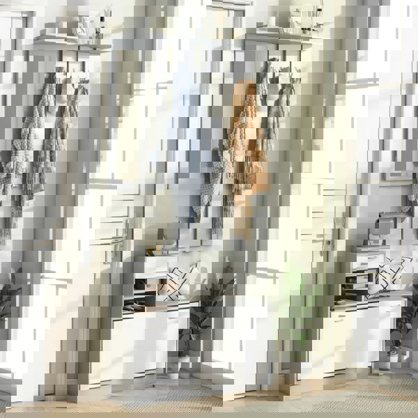 Keeping coats, bags, shoes, accessories and outerwear has never been so efficiently stylish. Crafted from particle board in a versatile grey and white finish, this HOMCOM 3-in-1 hallway organiser will keep your living space clutter-free. Alongside the six coat hooks, it features a pull-down shoe cabinet, a top drawer, a shelf for displaying ornaments and a handy mirror. You'll never misplace anything again!