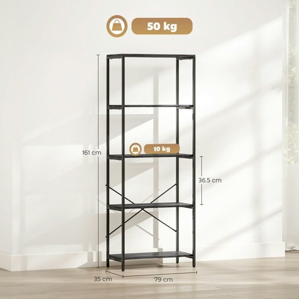 Striking storage, for an organised home, with this HOMCOM bookshelf. With five shelves there's plenty of room for holding books, decorations photos and more - easy to organise too. The metal frame means a strong core, fitted with a back 'X' bar for extra support. In a black and wood-effect design, this is an industrial-style design which brings added character into your home.