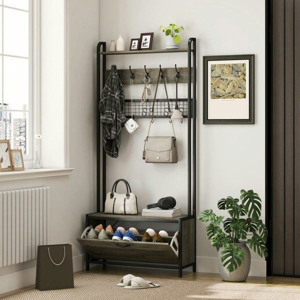 An all-in-one spot for coats, shoes, accessories - and so much more, with this HOMCOM hall tree. It combines a top shelf, 5x fixed double hooks, 5x movable 'S' hooks, bench seat and two-tier shoe cupboard: plenty of space for individual and shared use. The coat rack with shoe storage is made from steel frame for a strong core, so it supports everything in place. Complete with adjustable feet for balance.