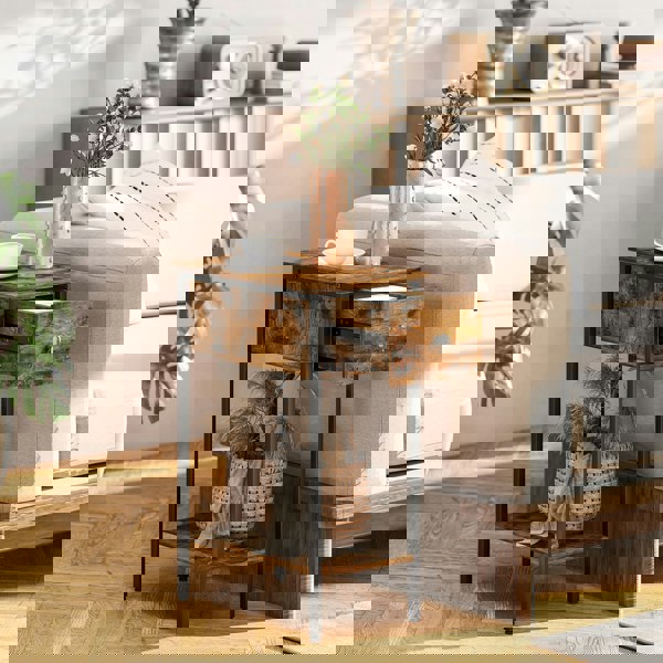 Discover the charm of the slim side table from HOMCOM, where functionality meets flair. Its compact design features a handy drawer and open shelf, great for tucking away bits and bobs. The industrial-style rustic brown panels and sleek black frame add a dash of sophistication to any room, be it as a bedside table, end table, or a quaint small coffee table.