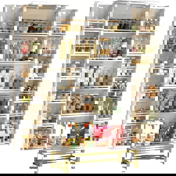 Designed for flexible use across the kitchen, dining room or hallway, adjustable shelving lets you tailor the layout as your storage needs change. Gold-tone handles add a refined finishing touch, and an elevated metal base creates a lighter, more open feel. Anti-tipping hardware is included for enhanced safety.