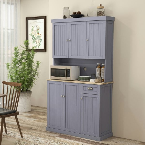 Bring style and space into your kitchen with this HOMCOM kitchen storage cabinet. Crafted from particle board, it's a solid addition to your home furniture. Spacious in design, it features two bottom and two top cabinets with multiple adjustable shelves, a pull-out drawer and an open countertop to ensure you have plenty of space in the kitchen. With a smooth surface top to ensure easy maintenance, the unit is finished with an anti-tipping straps on the back for safety.