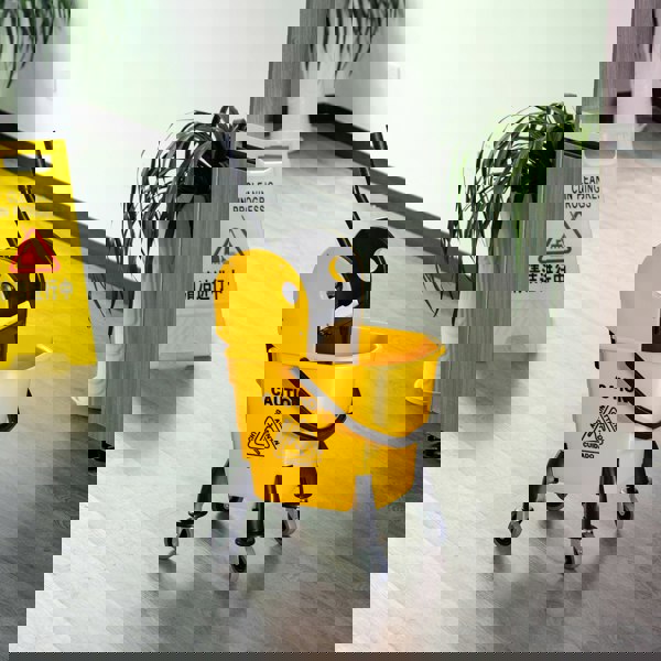 Make floor cleaning quicker and easier with this HOMCOM mop bucket and wringer. The 26 litre capacity gives you plenty of room for water and cleaning chemicals, to do several different places. The top removable wringer removes any excess water from the mop, so less excess water is used for quicker and safer drying. A bright yellow shell so it can be seen easily, this cleaning bucket for mop is complete with wheels to move around easily.