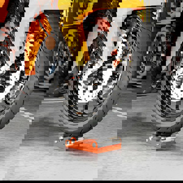 Simply roll your motorbike onto the ramped rollers for easy wheel cleaning and chain lubrication.
