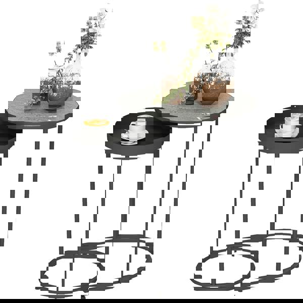 when not being used they nestle together to help save space. The small black table has a 4 cm raised edge - a protective wall to prevent items falling off. Its industrial-style design makes this a bold and stylish set.