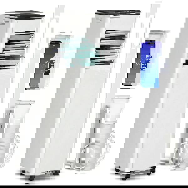 Control is flexible, with WiFi operation for adjustments by phone and support for voice commands via Alexa or Google Assistant. A 24-hour timer helps you plan cooling around your routine, while the self-evaporating system works alongside a water drain pipe and full warning to help prevent overflow. Finished in white and black, it moves easily between spaces thanks to 360° casters and integrated handles, and includes dual window kits for sliding and hinged windows.