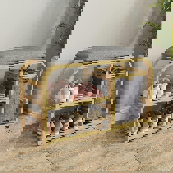The bamboo shoe storage bench with cushion from HOMCOM is a great way to elevate your entrance. Offering both chic style and practical functionality, this hallway bench with storage features a cosy cushioned top wrapped in soft linen-feel fabric, providing a comfortable seat as you put on your shoes. Neatly store up to four pairs of shoes on two racks and keep your essentials organised in the pull-out fabric basket. Our HOMCOM hallway storage bench is a must-have for any modern home.