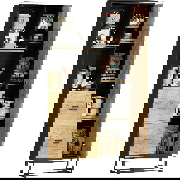 Maximise your kitchen space with this HOMCOM kitchen pantry. Built from robust particle board, the kitchen cupboard combines a sleek black frame with light wood-effect doors for an industrial look that stands out. Designed with two open shelves, two drawers and a cupboard with adjustable shelves, giving you plenty of versatile storage.