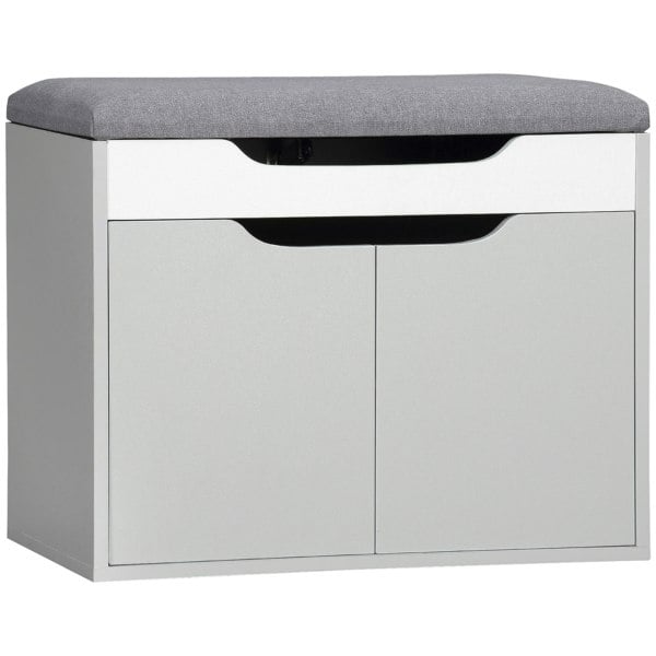 A compact and comfortable shoe storage with seat, from HOMCOM. Keep this shoe bench in your hallway for convenience when leaving and entering the house. It comes with a cupboard with adjustable shelf to keep four pairs of shoes in (approx. ) It also features a small top compartment for little bits and bobs - concealed up the padded lift up lid, which also acts as a seat when putting shoes on and taking them off. Completed with handy groove handles.