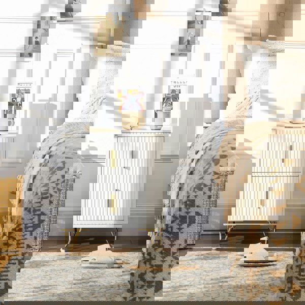 Add a soft touch of elegant texture into the bedroom and beyond, thanks to this HOMCOM dresser. The soft white colour comes with ridged drawer fronts, with gold coloured handles and hairpin legs - this is a beautiful design! With two drawers there's plenty of storage for clothing and more. These white drawers made from a particle board and MDF blend for durability.