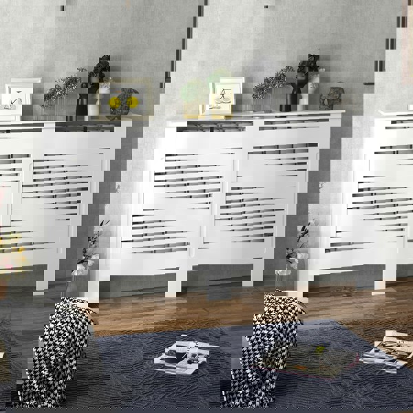 This modern radiator cover cabinet from HOMCOM is a designed to help hide old or unsightly radiator, protect hands from a hot surface and offer extra shelving for ornaments. The slatted design with sufficient vents allows for fluid heat flow while still preventing children and pets from touching the hot radiator surface. Manufactured from durable MDF in white finish for long term service, it is an elegant yet practical addition to your home and office.