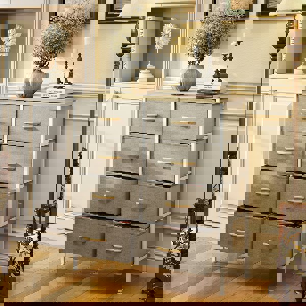 Home storage with this HOMCOM fabric chest of drawers. The eight fabric drawers offer room for lots of things - keep t-shirts, tops, bottoms and more organised. The wood-effect top offers more room: a great place to display your favourite photos. The steel frame makes a strong core, with adjustable feet for balance. Comes with anti-tipping straps for safety. Use all over the home and office.