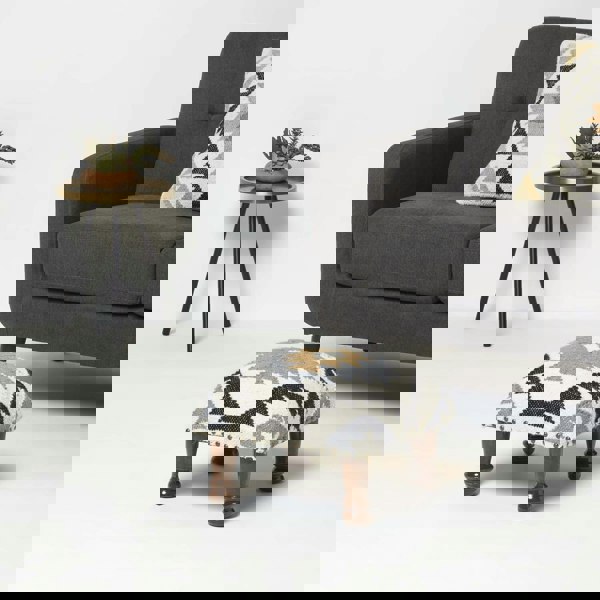 Agra – a high-quality handcrafted solid wood and kilim pouffe by HOMESCAPES. Combining modern colours with traditional handwoven kilim and a classic wooden base, this timeless piece merges comfort and style effortlessly.