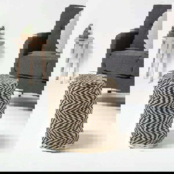 This tall footstool from HOMESCAPES features a timeless herringbone pattern in black and natural tones. The classic design adds texture and understated style, making it a versatile addition to both modern and traditional interiors.