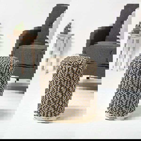 Upholstered in a black and natural diamond Aztec pattern, this pouffe is made from 90% jute and 10% cotton. Its retro style complements modern soft furnishings and pairs beautifully with distressed industrial furniture for a complete living room look.