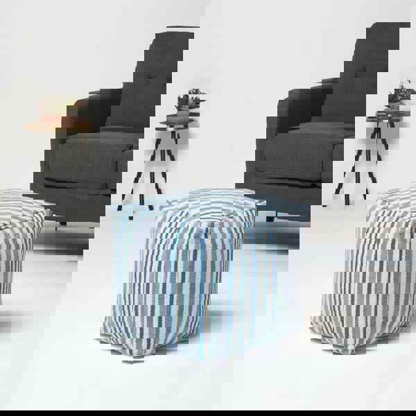 Add a pop of colour and modern style to your interiors with the HOMESCAPES striped cotton bean cube pouffe. Featuring a contemporary striped pattern in cream, navy and aqua shades, this footstool brings visual interest to any room and complements a wide range of furniture and décor styles.