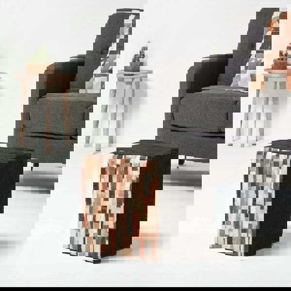 In rich, chocolatey tones of brown, tan, and cream, this tile print cube from HOMESCAPES is a stylish way to introduce visual texture and warmth to your living space. The patterned recycled leather finish adds depth while remaining neutral enough to suit a variety of interiors.