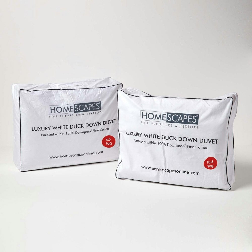 Experience year-round warmth and comfort with the HOMESCAPES Luxury White Duck Down All Seasons Duvet. This versatile 15 Tog set includes two duvets — a 10. 5 Tog for spring and autumn, and a lightweight 4. 5 Tog for summer — that can be fastened together to create a cosy, extra-warm 15 Tog duvet for the coldest winter nights.