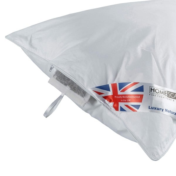 Create a peaceful and restorative sleep environment with the HOMESCAPES Camomile Infused Goose Feather and Down Pillow. Expertly crafted for both comfort and wellbeing, this luxury pillow contains a removable cotton pouch filled with dried camomile flowers, known for their soothing and stress-relieving properties.