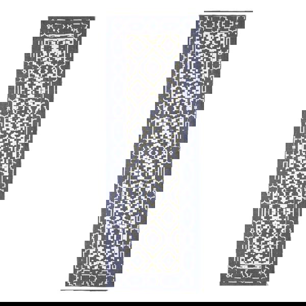 Add effortless Nordic charm to your interiors with this hygge-inspired rug from HOMESCAPES. Featuring a deep blue base with a bold white geometric pattern and border, the Halmstad rug delivers clean lines and minimalist style, perfect for contemporary and Scandi-inspired homes.