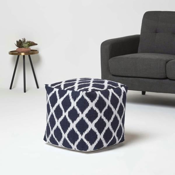 Add a touch of pattern and character to your home with this HOMESCAPES navy and natural beige bean bag cube. Featuring a classic Ikat design with a recognisable bleeding diamond pattern, this pouffe pairs beautifully with both light and dark furniture tones, creating a stylish contrast in any room.