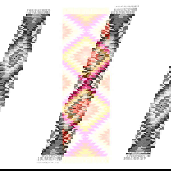 Bring bold colour and pattern into your home with the HOMESCAPES Jakarta Rug. Featuring a striking diamond and tribal-inspired design in bright yellow, pink and orange, this rug makes an eye-catching centrepiece for any room.