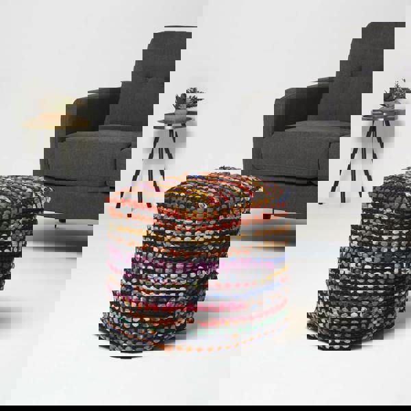Available in a choice of three sizes, the HOMESCAPES Folk Chindi pouffe is a brightly coloured and versatile footstool designed to bring comfort and character to your home. Ideal for bedrooms, living rooms or dining spaces, this vibrant pouffe works perfectly as a footrest, occasional seat or decorative accent.