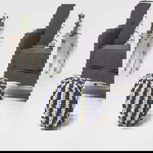 HOMESCAPES Navy and White Knitted Pouffe Striped Footstool