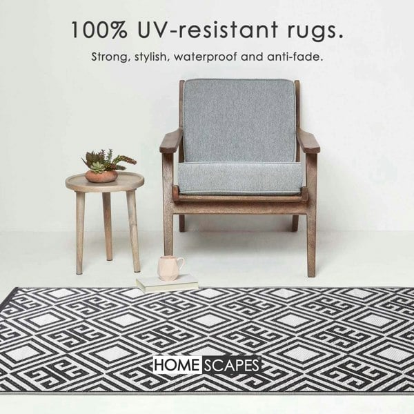 Add a touch of style to your outdoor living area with this elegant garden rug from HOMESCAPES. Featuring a bold black and white geometric pattern, this rug brings modern flair to patios, balconies, and terraces.