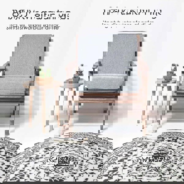 Featuring a striking mosaic-style design, this round rug from HOMESCAPES adds character and style to your outdoor living area. Woven from 100% polypropylene in a timeless black and white colourway, it’s ideal for patios, slabs, and decking.