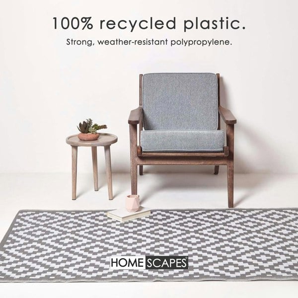 Enhance your outdoor living space with this large decorative garden rug from HOMESCAPES. Featuring a modern grey and white geometric pattern, it adds instant style and character to any patio, decking, or balcony.