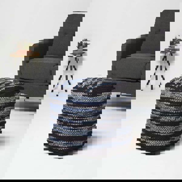 Woven from denim and cotton on traditional handlooms in India, the Texas footstool is carefully constructed by hand. Its square design is filled generously with lightweight polystyrene beads and lined with polyester for durability and shape retention.