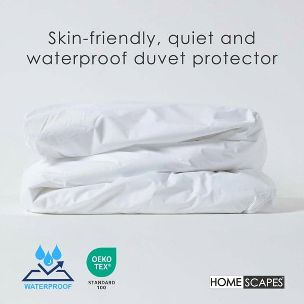 Keep your duvet clean and fresh with the HOMESCAPES Waterproof Duvet Protector. Newly improved, this lightweight and noiseless protector guards your bedding against spills, stains, and accidents, while rejuvenating tired duvets to prolong their life. Its soft, discreet design ensures it remains unnoticeable under your duvet cover, providing both protection and comfort.