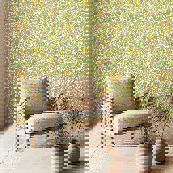 Realistic honeysuckle vines intertwine with leaves and weave across the wall. Inspired by the detailed illustration by May Morris this design pays homage to the arts and craft design era.