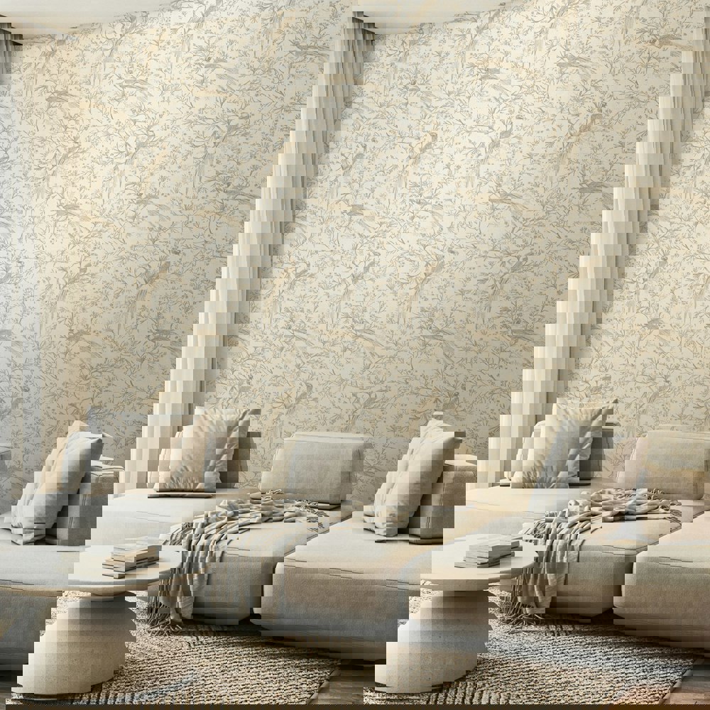 Bird Toile blends artistic expression with natural elegance. Perched among flowering branches and leafy stems, long-tailed birds with feathered crests bring a touch of personality and quiet storytelling to the scene. Rendered in inky, sketched lines against a soft, linen-textured ground, this design has a hand-drawn charm.
