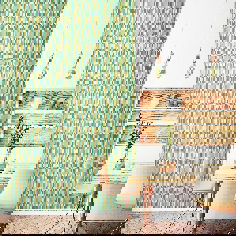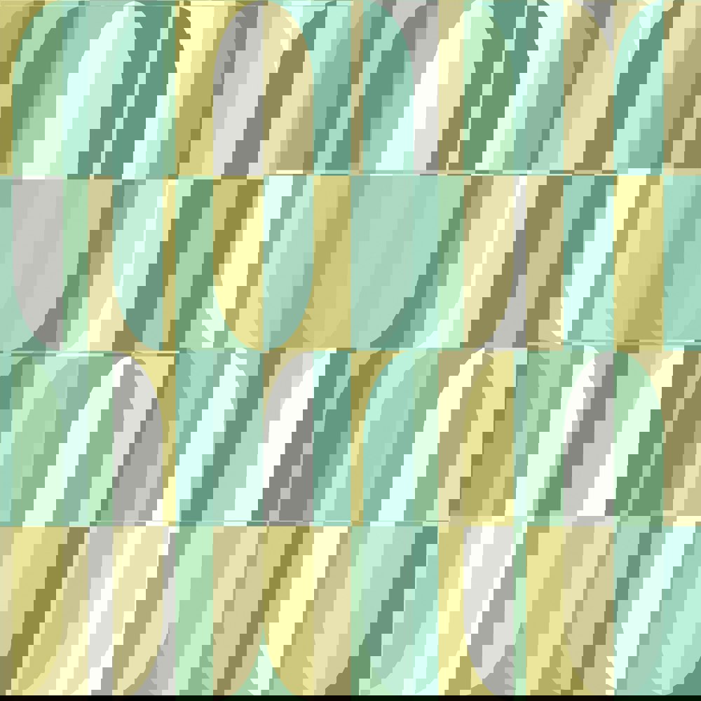 Tall lozenge shaped blocks mix and match, dancing and mingling throughout the design to create a lively all-over graphic design with a nod to the 1970’s. Small scale and easy to use in any interior.