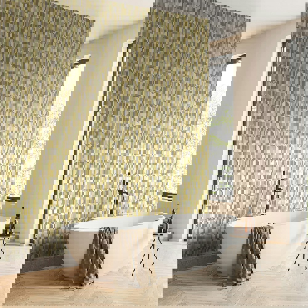 Tall lozenge shaped blocks mix and match, dancing and mingling throughout the design to create a lively all-over graphic design with a nod to the 1970’s. Small scale and easy to use in any interior.