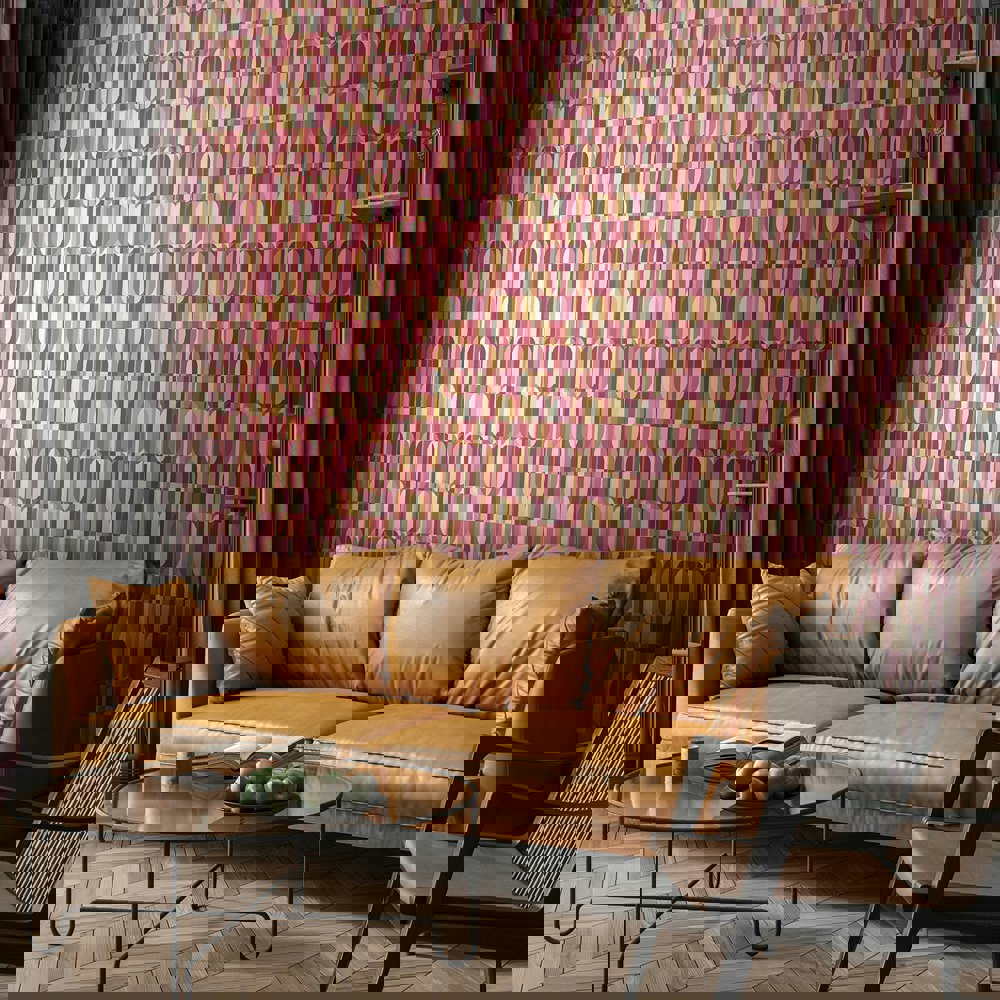 Tall lozenge shaped blocks mix and match, dancing and mingling throughout the design to create a lively all-over graphic design with a nod to the 1970’s. Small scale and easy to use in any interior.