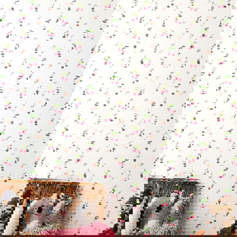 Keep things sweet and simple with this pretty yet versatile design. Cheery cherries and little flowers are dotted against a plain ground, creating a clean and calm feel, whilst the use of watercolour adds a textural charm. The perfect wallpaper for adding a touch of understated character.